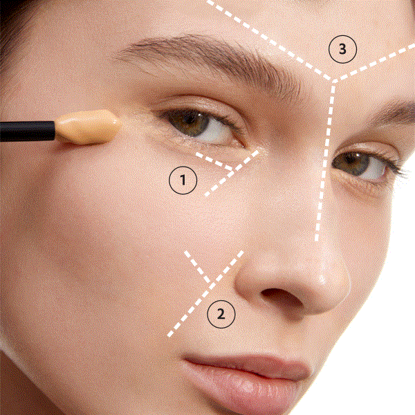1. 刷棒的寬面在眼下倒三角區域畫出「Y字」再均勻推開,利用刷棒斜壓方式遮瑕黑眼圈、柔焦淚溝等細紋問題。