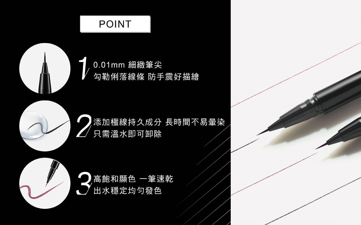 採用超極細筆尖,能夠輕鬆勾勒出 0.01mm 的細緻眼線,即使是下睫毛也可以自由自在描繪。