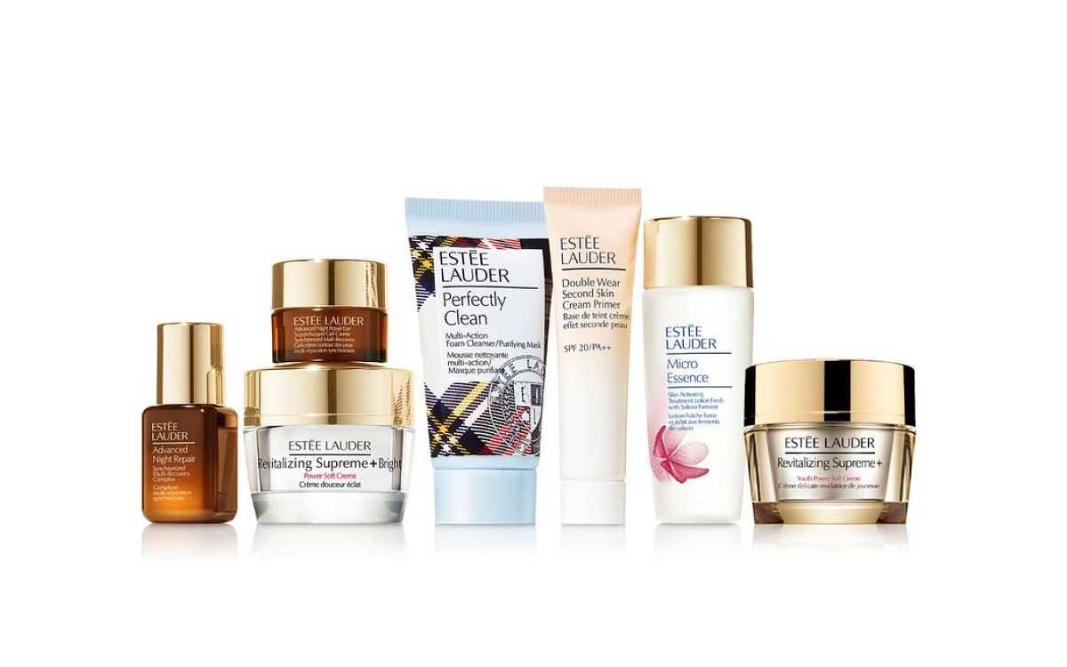 圖片來源:雅詩蘭黛 • 凡於活動當日消費滿NT$8,000元且含一件底妝產品,即贈價值NT$5,482元《全方位度假保養組》,內含《特潤超導全方位修護露7ML》、《特潤全能修護亮眼霜5ML》、《年輕無敵亮顏霜15ML》、《年輕無敵膠原霜15ML》、《微分子肌底原生露 櫻花輕盈版30ML》、《細緻煥采雙效淨化潔面乳30ML》、《粉持久天生美肌乖乖乳15ML》。(任一底妝不含遮瑕類、工具類產品)