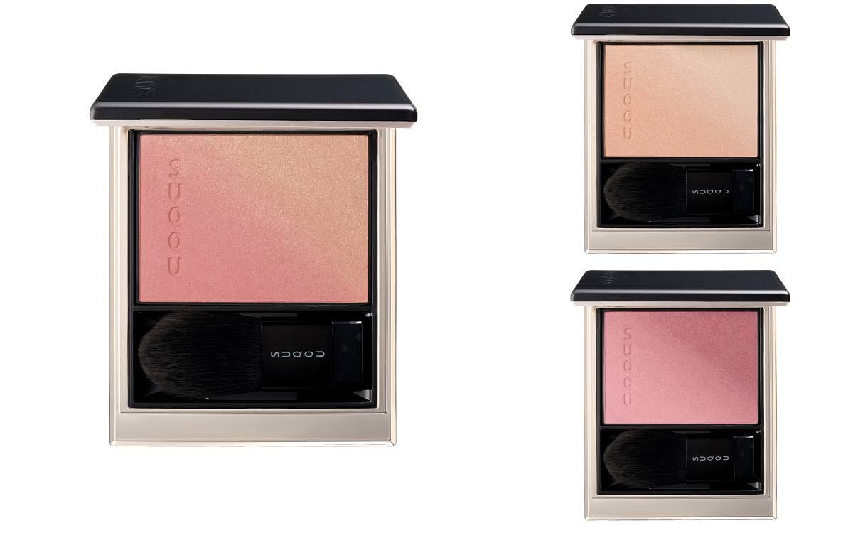 豐富蘊含微細珠光, 表現SUQQU獨有的光澤處方。「Cheek - 頰彩」能在表面散發珠光的亮澤, 賦予高雅的光澤感、「Highlight - 打亮」能呈現出點狀閃爍的微細珠光, 給予華麗的光亮感。珠光粒子不會凝聚結塊, 能細緻均勻的服貼在肌膚上,色彩的邊界線也能輕易的暈開, 營造出更顯自然的光澤粧效。
