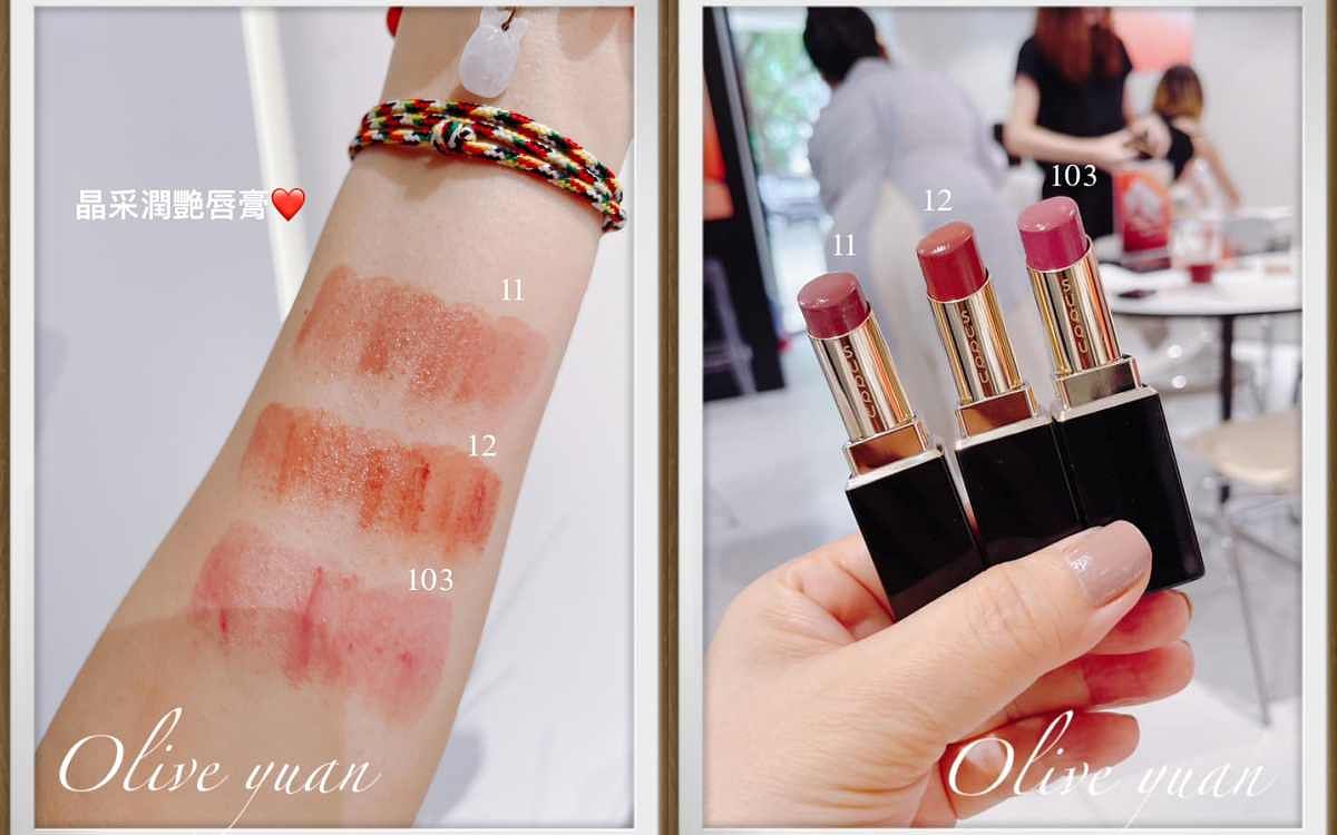 圖片來源:觀玲老師「晶采潤艷唇膏(NT2,050)」的質地跟之前的很像,但這次的光澤膜有厚度,靈感來自烘焙甜點塗抹的果醬或糖漿,是的!顏色也比較透明,「11潤茶」及「12秋溶」是新色,「103透秋櫻」是限定色,我拿到「103透秋櫻」,是冰冷粉紅色調,是透出藍感的純淨色。