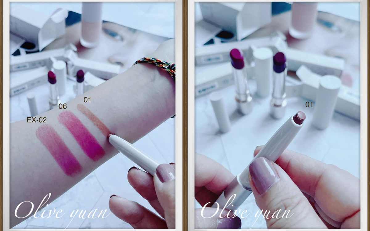 圖片來源:觀玲老師另外這12色都帶有微妙的棕色感,調配出時髦的暗感色澤,但塗在嘴唇上又非常純淨,因為添加了「清透亮澤粉末」,再來服貼感與立體感部分是因為「軟蠟」,這種優質油能讓雙唇滑潤舒適不卡卡,抹起來就是順。還有、「鎖色技術」能讓唇彩延展後凝膠化,產生不易沾染的效果,長時間保持顯色、光澤,長時間維持剛上色的妝感。我拿到的06超美的!是覆盆子粉紅色調,它雖然帶有藍感,卻能讓肌膚顯出透明度,塗起來比口紅本人更美。另外EX-02是限定色,它是紫丁香色調加上亮澤金色珠光,所以跟一般紫色調不同,我帶黃感的膚色用了也很OK!