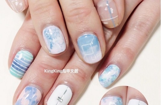 以白色為基底的暈染漸層,就好比晚霞與雲朵輕輕漾開,唯美討喜又不失個性感,迷濛一片的指面也充滿著夢幻氣息,與女孩們喜歡的粉紅、粉藍與嫩綠色都十分協調,也是今年大勢主流。