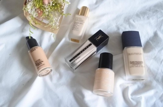 laura mercier極限超時親膚粉底液 / 雅詩蘭黛 粉持久微霧光澤水粉底 / YSL 恆久完美無瑕粉底 / 植村秀 鑽石光植萃精華粉底 / M.A.C 超持妝無瑕粉底液