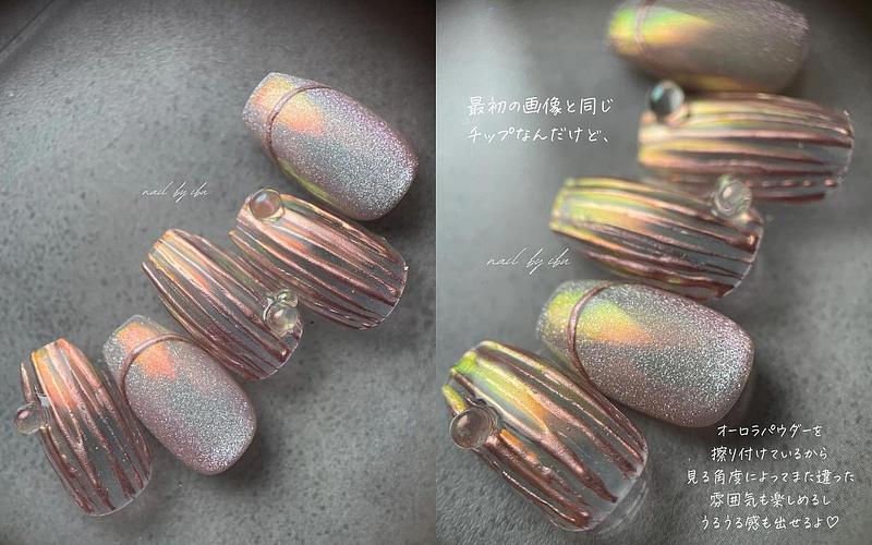 春夏指尖想要帶點華麗透明感很推薦這一款,以鏡面調色加入亮粉,打造出不規則線條感彷彿極光般耀眼,還有一點立體小裝飾,整體設計看起來造型感滿分。