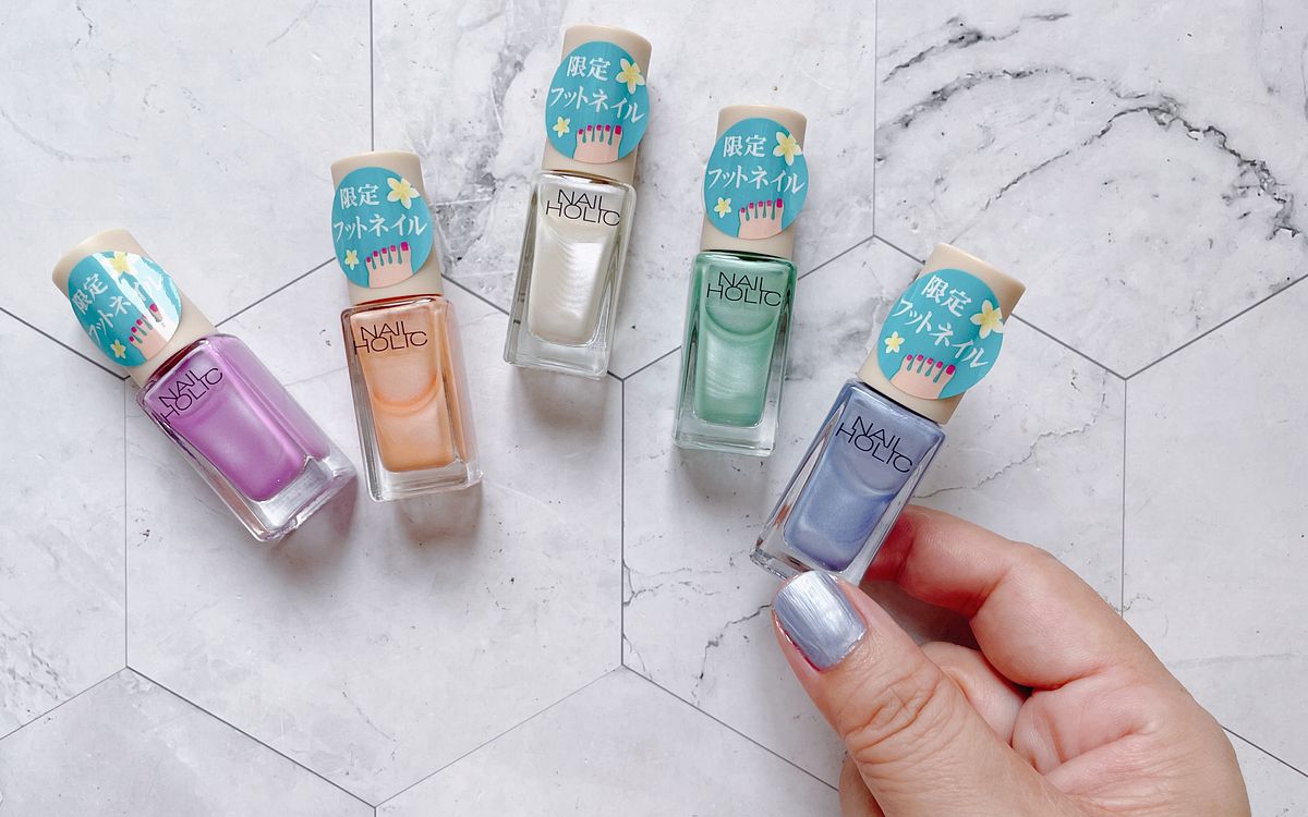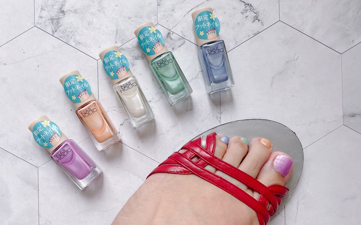 夏天穿涼鞋也一定要擦指甲油吧!為足部設計的「繽紛配角指甲油」為了增添腳尖華麗感,5款顏色都以纖細珠光、有如緞帶般微光效果的質感為主。