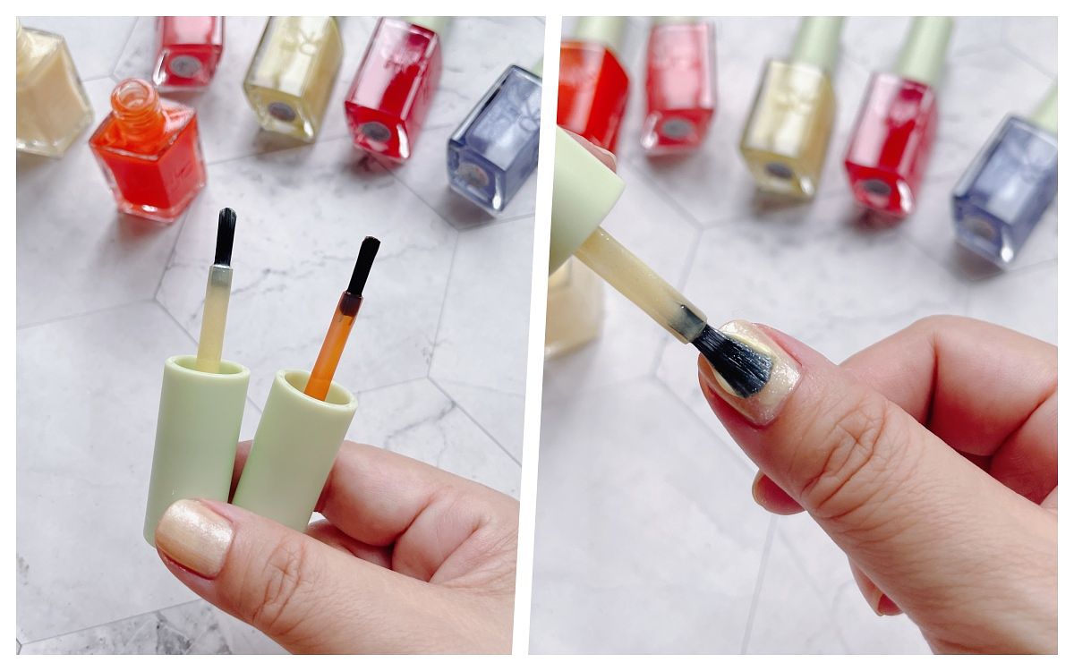 以牛奶粉色為主的5款顏色,還特別添加高亮澤感“厚實保護膜”,可修飾甲面的凹凸不平,而且緊密附著不易掉色,連刷毛都設計成好塗的短毛刷頭!