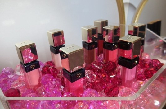 會場兩旁也陳列了新品,有「奢華豔光唇晶蜜」8色,「光采絲緞無瑕膏」,「塑妍逆引菁萃」,這「奢華豔光唇晶蜜」的顏色看起來粉粉透透,自從唇膏流行後,唇蜜類型產品也都轉型成顯色度超高的唇釉類,感覺唇蜜消失好一段時間了,反而令人開始想用了。
