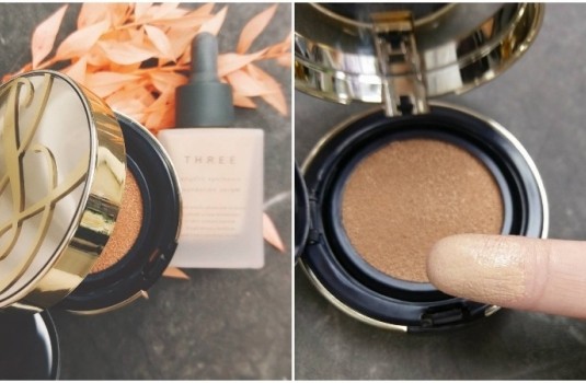粉底液加上氣墊粉餅的上妝方式大概已經持續了至少一年以上!這樣上妝後發現不只妝感更服貼,妝容的光澤度也會跟著提升!在粉底的部分推薦的是近期熱愛的「THREE天使煥采精萃粉底」,上在肌膚上的貼合度與光澤度,看起來真的很透亮自然,就像原生肌膚的膚況!然後我會再搭配上也是最近完全心頭肉等級的「ESTEE LAUDER粉持久超級無瑕氣墊粉餅」,薄薄的使用在兩頰與T字部位,那呈現出的半霧半光澤膚質,不只讓肌膚的整體質感完全提升,底妝服貼度也非常持久,這款氣墊是四月剛上的商品,所以即使是炎熱的夏季使用也完全沒問題,真的可以去試試看唷!兩者搭配使用,一整天都不太需要補妝!真的是我目前底妝的秘密武器,推薦給大家囉~