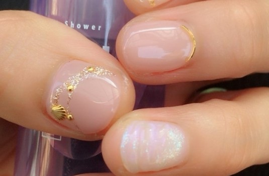 透乳色的粉紅色與金色愛心項鍊也是絕美的搭配喔!只要單一只有項鍊造型就立刻將單調的指彩變得特別~