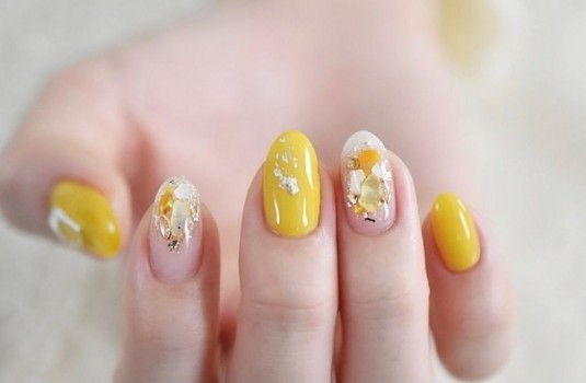 如此可愛的奶油檸檬色調,想要搭配出氣質感也是沒問題的唷!結合奢華玻璃亮片,讓光療指彩更有層次感,想要打造出更多變化還能再加入一個叫深的顏色,讓雙手質感再UP!