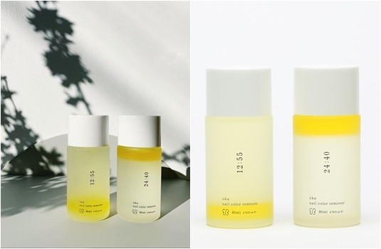 uka保濕護甲除光液共有12:55與24:40兩款。陽光般的檸檬黃凍飲色調,水油雙層:半透明的除光水層能溫和卸除所有殘色;鵝黃保養油層則在卸除的同時立刻補上滋養,讓保養的程序更加完整。