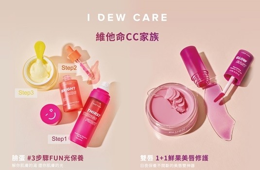 首先登台的「維他命CC家族」,全系列產品添加維他命C成分,其中臉蛋#3步驟FUN光保養,包含1噴紅橙C修護精萃水、2滴葡萄柚C亮顏精華以及3攪檸檬香蕉C雙效凝霜,3款產品為保養流程帶來全新感受,顏色來自天然鮮果萃取及維他命添加,可放心使用,結合視覺、觸覺、嗅覺,替肌膚解渴、補水、保水,還給肌膚最原生的光澤!