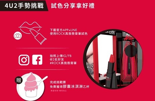 ROCK 手勢動作搭配歌曲於專區拍攝成短影片,上傳至 Instagram 個人平台公開發佈(非限動),並@MAKEUPFOREVER 及#ROCK 真我唇膏筆,自2020 年 8 月起至 12 月止,每個月 5 號抽出一位幸運得獎者,將獲得「ROCK真我唇膏筆 4U2 訂製禮」,限定限時絕無僅有!