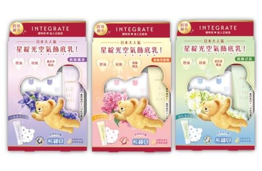 迎接春天到來,2021年3月日系開架彩妝品牌INTEGRATE櫻特芮將與熊寶貝跨界聯名,推出超療癒的「空氣飾底乳香氛限定組」,買添加天然植萃精油的「星綻光空氣飾底乳」就能獲得同樣散發療癒香味的「熊寶貝衣物香氛袋-衣服的淡香水」,讓每位大人女孩無論在上妝、或在日常生活,都能被細緻的植物香氛圍繞。含有薰衣草精油的「星綻光空氣飾底乳-亮顏紫」將搭贈雅致藍風鈴香氛袋,含有柑橘精油的「星綻光空氣飾底乳-光透黃」將搭贈典雅玫瑰香氛袋,含有天竺葵精油的「星綻光空氣飾底乳-勻色綠」將搭贈氣質小蒼蘭香氛袋。散發精油芳香的飾底乳搭配衣服的淡香水,讓大人女孩走到哪都是迷人的香香公主!
