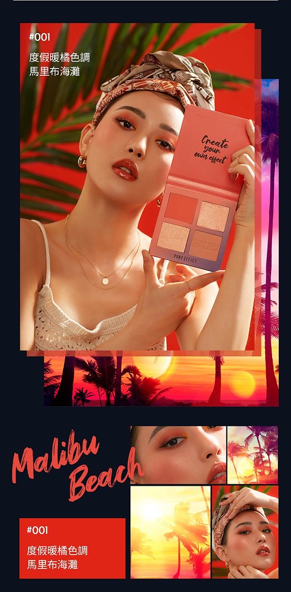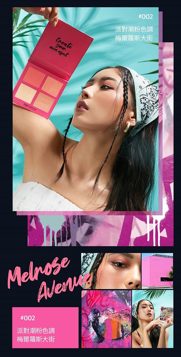 這個夏日,PONY EFFECT推出限量L.A.潮光多功能眼頰盤,以潮流之都L.A.為靈感,精選度假與派對兩種異國色彩,將馬布里海灘和梅爾羅斯大街的景致設計在眼頰盤中,讓你一刷置身異國,L.A.美妝潮人必備色彩All in!一盤多用,可作為腮紅、眼影、打亮與修容,讓PONY EFFECT帶你用彩妝展開一段美好的旅行!