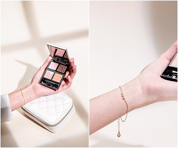 台灣飾品界指標「Vacanza_accessory」假期飾品,首度與資生堂心機彩妝聯名推出「熱戀甜美心機禮盒」,搭配巧克力眼影盤色調及風格,設計 「甜美方塊.手鍊」材質選用低敏925純銀製作,外層採18K包金色工藝,呈現飾品完美質感及持久保色光澤,以小巧細膩造型妝點,舉手投足展現低調而細緻態度。