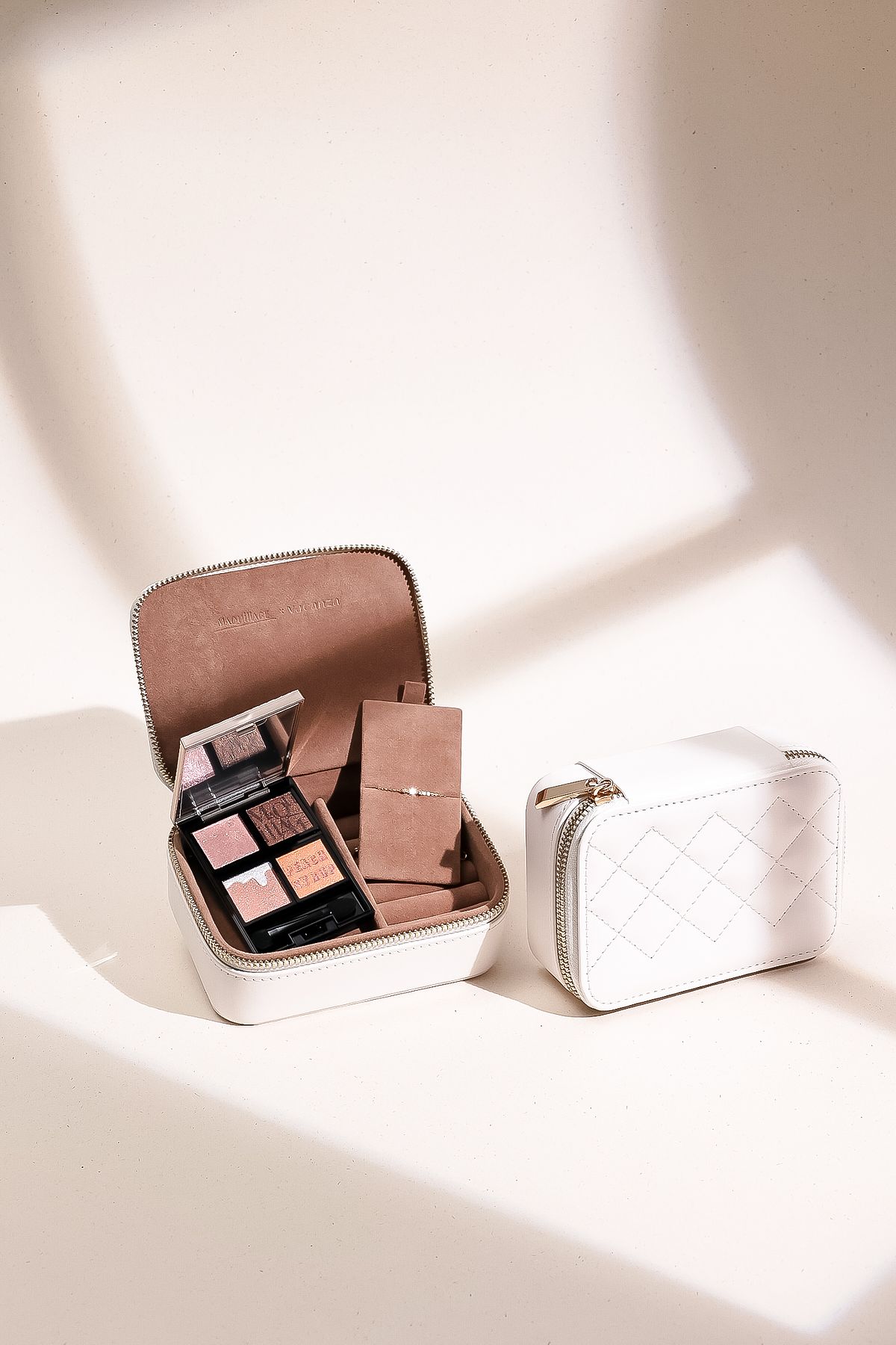 結合優雅兼具質感的風格,不僅專為此聯名設計出浪漫奶油白色的皮革飾品收納盒作為禮盒外盒,更結合心機彩粧春季新品「熱戀巧克力拼色眼影」與Vacanza首度亮相的甜美春花手鍊,替女孩們搭配好初春LOOK,只要擁有就春光閃閃!