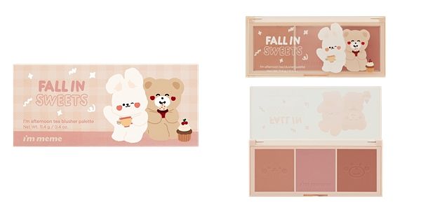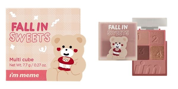 最懂女孩、最會調色的I'M MEME每檔新品總是推出各種吸引人的包裝,不小心就會讓女孩們荷包大失血,I'M MEME限量推出與韓國超人氣療癒系文創品牌Malling Booth的聯名彩妝系列,在韓國以搞怪可愛風聞名的品牌「몰링부스 Malling Booth」其中最受歡迎就是櫻桃系列插畫,結合招牌軟萌角色-Bebe熊跟Hato兔,與I'M MEME熱銷明星商品眼影、腮紅、唇膏融合少女最愛的甜食,打造期間限量的「Fall in sweets超萌甜點」彩妝系列,完全零廢色,實用且療癒,讓韓妞們紛紛陷入瘋狂。