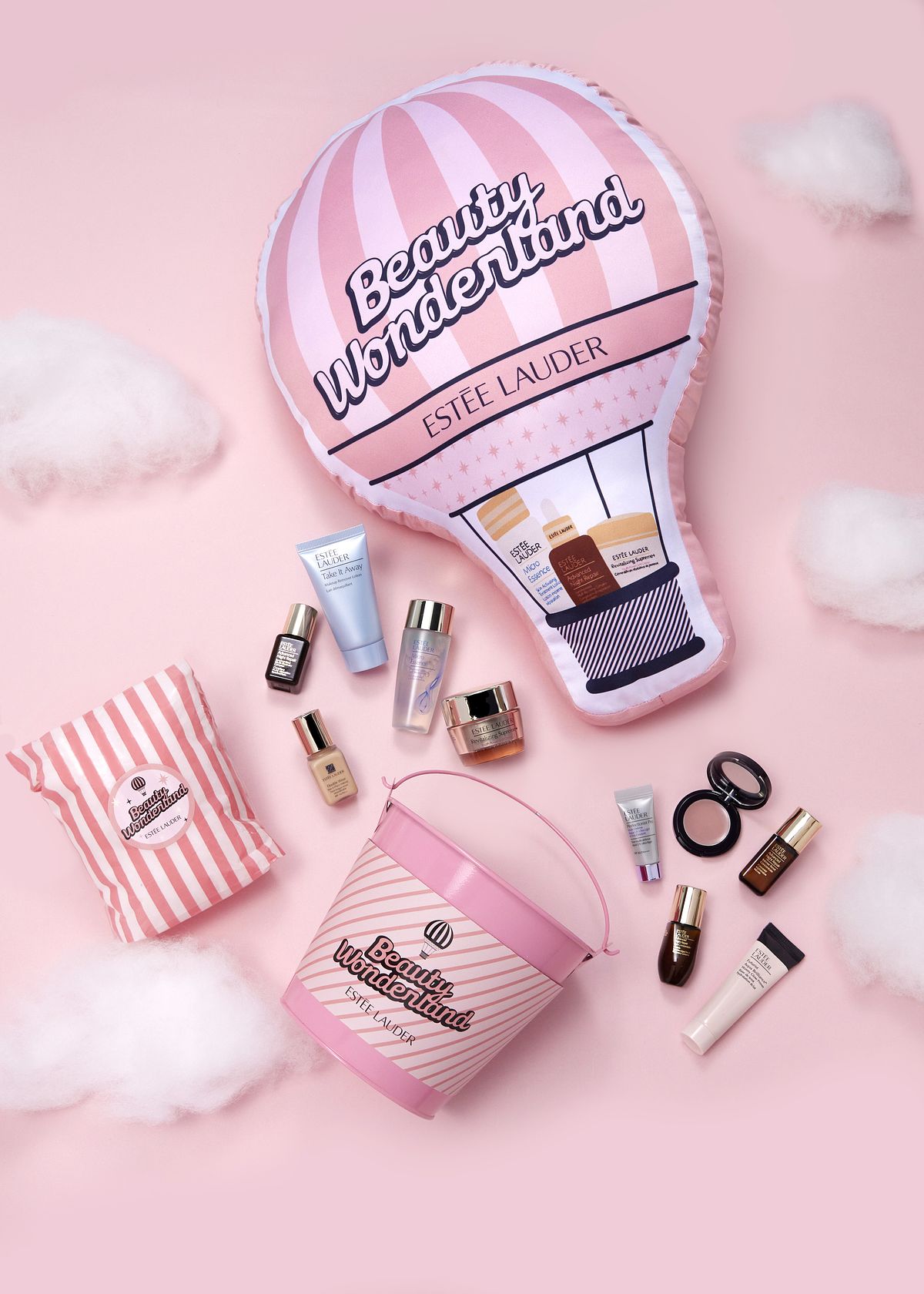 凡於指定雅詩蘭黛專櫃*週年慶開打首1日,購買高效保養年輕金三角系列任一正貨產品(即原生露200ML、小棕瓶50ML、無敵膠原霜75ML擇一,含組合),即贈價值NT.6,346的美力熱氣球組乙組,內含雅詩蘭黛超豪華明星美妝品10件組:《微分子肌底原生露30ML》、《特潤超導全方位修護露 7ML》、《年輕無敵膠原霜15ML》、《特潤冰導緊緻眼部精華 5ML》、《特潤超導賦活精萃 5ML》、《清新淨妍潔顏露 30ML 》、《粉保濕水啵啵妝前精華15ML》、《Pro全能防曬超輕感水凝露SPF30 PA++++ 5ML》、《粉持久完美持妝粉底SPF10 Sand 7ML》、《粉嫩慾望晶透潤唇膏1.6g》,彈嫩美肌與無瑕妝容一次輕鬆擁有!此外,還有療癒感十足、萌力滿點的美力熱氣球抱枕,可放在附贈的精緻甜粉鐵桶當作超Q的居家擺飾,或是用鐵桶裝滿爆米花抱著蓬鬆Q彈的熱氣球抱枕在家追劇,讓你天天都在樂園模式、隨時被可愛爆擊!如此實用又萌到讓人尖叫的首日限量組合,必定讓所有粉絲的腦內啡衝到最高,與朋友相揪在雅詩蘭黛美肌樂園瘋玩一波!