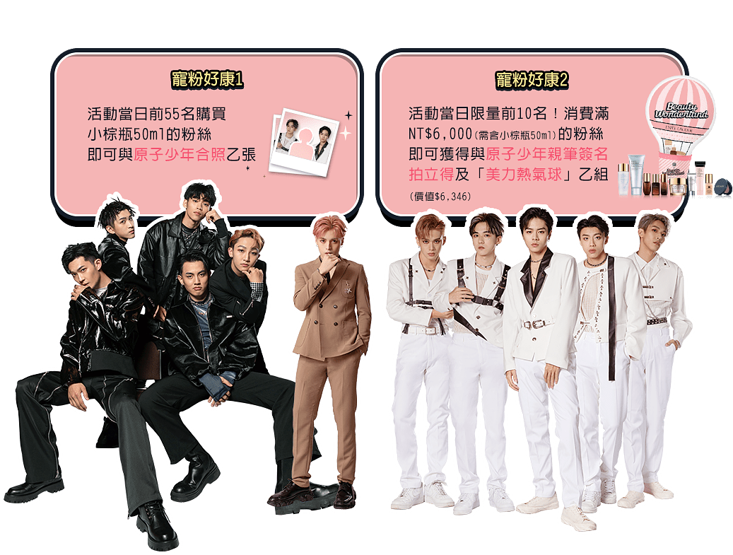 寵粉寵進心坎裡!站在潮流話題尖端的雅詩蘭黛,今年特別聯手人氣狂飆、讓全台數萬粉絲心跳漏拍的「原子少年」,擔任雅詩蘭黛美肌樂園活動大使,親自為粉絲們介紹原子少年們私下最愛的No.1修護精華《特潤超導全方位修護露》—穩定修護肌膚最有感、適合所有膚質使用的霸主精華「小棕瓶」!活動當日更熱情加碼史無前例、最好康的粉絲福利:活動當日前55名購買《特潤超導全方位修護露 50ML》的朋友,可與原子少年合照乙次;前10名消費滿NT.6,000且含《特潤超導全方位修護露 50ML》的朋友,更可獲得超級珍貴、寶藏級的原子少年親筆簽名拍立得及「美力熱氣球組」(價值NT.6,346)乙組!創造與原子少年一起做夢都會笑的幸福回憶,把握機會實現夢幻心願!原子少年出席場次火熱公開中,粉絲們務必在行事曆上做好筆記、設好鬧鐘,活動當天排隊衝頭香,讓我們一起用尖叫聲掀開樂園屋頂,近距離感受少年們的魅力爆擊!