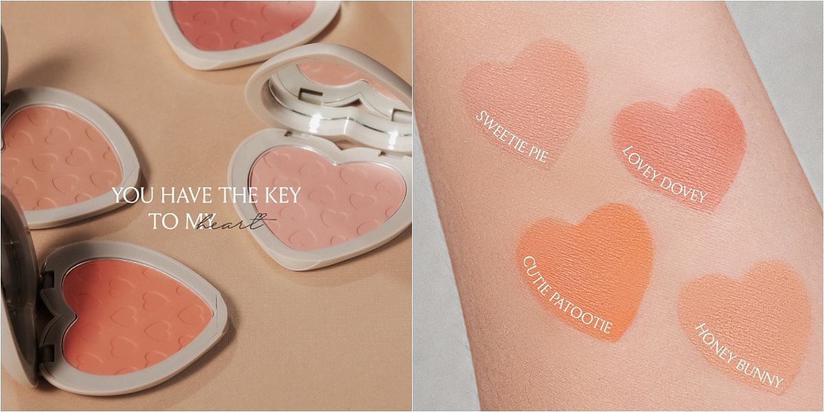 「簡單愛腮紅」從裡到外皆是愛心形狀無一不惹人心動,愛心外殼搭配滿版心型壓紋烙印,小巧思墊片更是放上「You have the key to my heart.」字樣,讓人一打開充滿驚喜感,默默驚呼:沒錯!你就是那把鑰匙,我心中的鑰匙。以亞洲肌膚所調配的嚴選四色,一刷擁有法式氣質的奶茶色『Honey Bunny』,隱隱約約透出高雅好氣色、『Sweetie Pie』就像是溫潤蜜糖色系,顯色柔和讓人更想零距離接近你,『Lovey Dovey』輕甜的自然紅潤色,宛若三分微醺的迷人,一抹綻放電力笑顏,而最顯白襯膚的『Cutie Patootie』,輕刷有如暖陽般的能量,打造滿滿元氣;添加白芒花籽油、維他命E、乳木果油等植物萃取,讓粉質服貼肌膚,打造輕盈零粉感,每個時刻呈現完美膨潤好氣色。