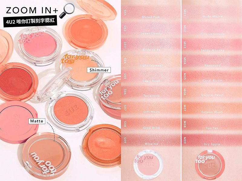 4U2唯你訂製刻字腮紅系列共有18色,為了搭配不同的妝感,不只豐富的選色,質地也使用霧面高質感、亮面細緻珠光兩種變化。其中主打裸色、鮭魚粉、蜜桃橙調,都是既適合暖暖春天又不突兀的自然色調,不會讓亞洲女孩們的膚色顯黯沉蠟黃,宛如天生好膚質,自然透出紅潤好氣色。快來看看主打推薦款有哪些!