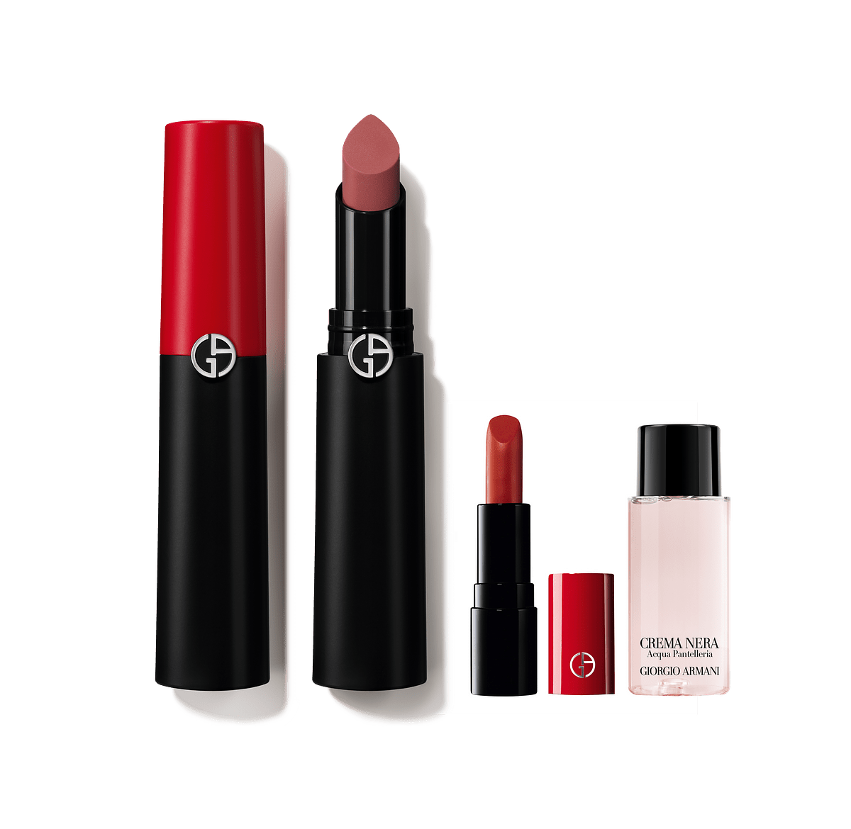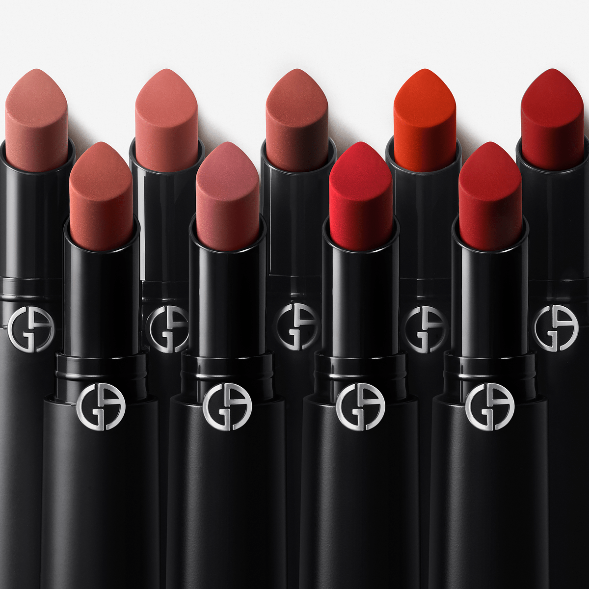 全新【奢華絲絨訂製唇膏】延續亞曼尼高訂優雅的美學,唇膏管身依舊是經典簡約的高級紅黑搭配,呼應霧面妝容特以嶄新磨砂鏡面設計出全新細黑霧管 ,水滴切面精準描繪唇形,從容一抹完妝,把女性恣意享受生活的態度透過上妝儀式徹底表現。