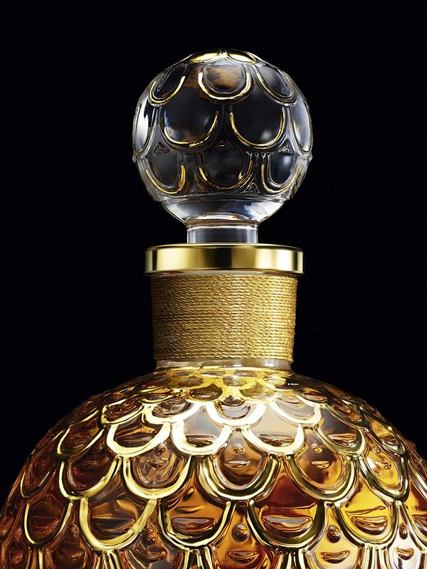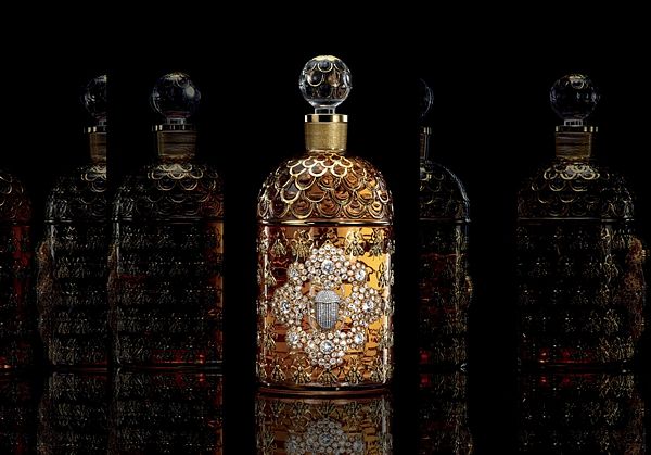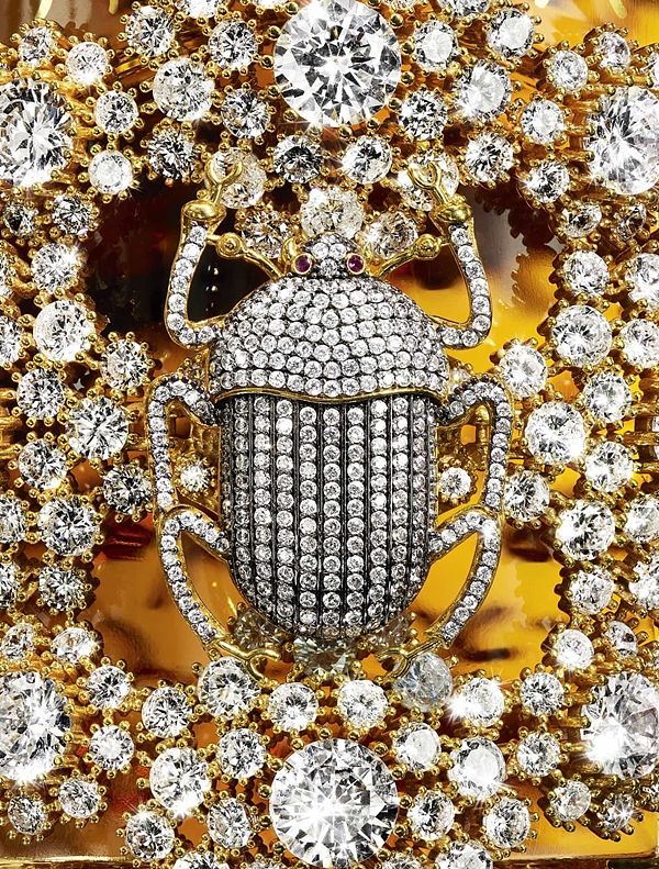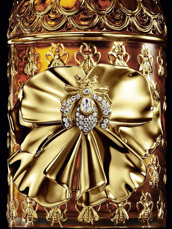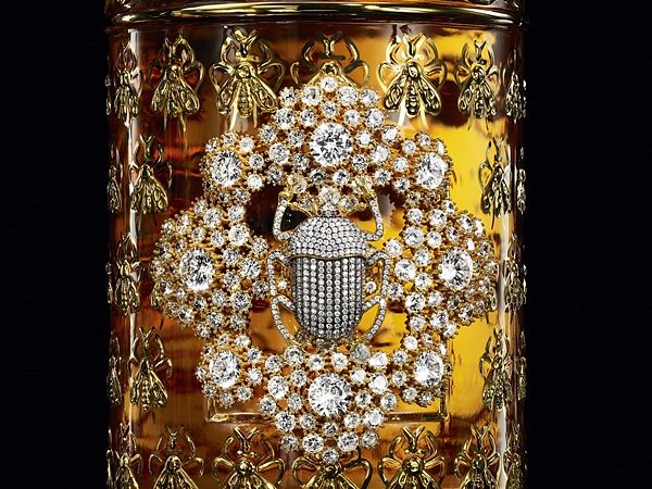 奢華無比的幸運符,BEGÜM KHAN的水鑽甲蟲凜然地置在1公升裝蜂印瓶的標誌處。這華麗的甲蟲飾品身邊圍繞著數顆水鑽,形成玫瑰花結的圖樣閃爍著,宛如羅盤一般指向四個方位。
