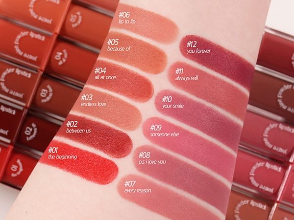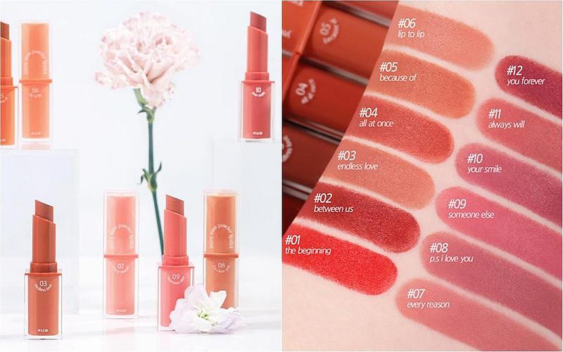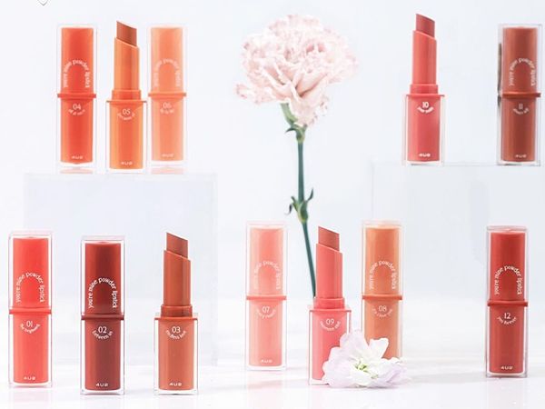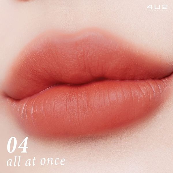做為4U2史上最暢銷的系列「4U2 YOU'RE MINE我的天鵝絨唇膏」,以全新的包裝和色系回歸了!全系列共有12色,保留了第一代的粉色系、橘紅色系,並依照色系調製了冷色調和暖色調適合更多不同膚色的女孩們可以隨心選擇。唇膏整體柔軟、光滑的粉狀啞光質地,柔軟的觸感抹上後依然輕盈舒適,能維持持久妝感,並模糊、遮蓋唇色。即使是霧面唇膏質地也不會過於乾燥,富含維生素E、摩洛哥堅果油等保濕配方滋養雙唇,看起來依然滋潤、光滑,讓霧面唇膏也能保有潤澤感受!喜歡日常一點妝感的女孩們也不用擔心太過厚重,抹上後可以輕輕抹開後用手指暈開或是在衛生紙上輕抿,妝感更加自然漂亮,也可以讓唇彩更加持久不掉色、不易沾杯。「4U2 YOU'RE MINE我的天鵝絨唇膏」最適合秋季的主打唇色推薦: