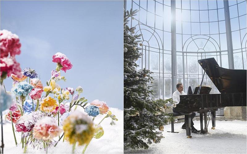 今年,調香師的靈感來自於大家為聖誕節的熱切期盼。大地被白雪覆蓋,在一個華麗的法式花園中,座落著一個美麗溫室。Francis Kurkdjian坐在鋼琴前,演奏莫扎特的歌劇『魔笛』中的《Papageno Papagena》,悅耳的音樂聲在溫室圓頂上迴盪,一對小鴛鴦正環繞著他飛舞,並停在節拍器上,打亂歌曲的節奏和速度。音樂愉快地加速,在外面,五顏六色的花朵同時間綻放,像是將花園淹沒在音樂瀑布中。無數香水瓶在雪花中快樂地展現,標誌性的香氣在冬日陽光下閃閃發光。