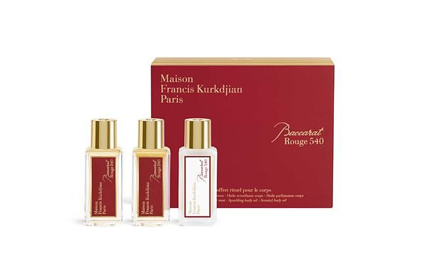 節日假期是創造幸福和實現願望的最佳時機。Maison Francis Kurkdjian全新推出 Baccarat Rouge 540身體護理套裝,包含三款 35 毫升的產品:香氛身體油、髮香噴霧和奢華閃亮身體油。這三款璀璨奪目的Baccarat Rouge 540作品盛載於標誌性的紅色外盒中,散發著同樣明亮而馥郁的香氣。這個套裝結合了香氛的珍貴質感和完美配搭的護理儀式,為您帶來獨特的芳香愉悅感受。