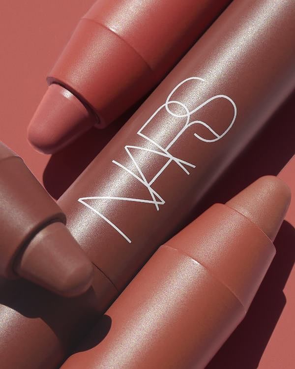 NARS 特霧絲柔精準唇筆 2 支,專業後台彩妝師愛用色號:先使用 #DOLCE VITA 888 乾燥玫瑰作為打底色,接著使用 #WALKYRIE 180 霸氣裸棕 堆疊暈染,兩層疊擦打造時髦又搶眼的韓系漸層感。