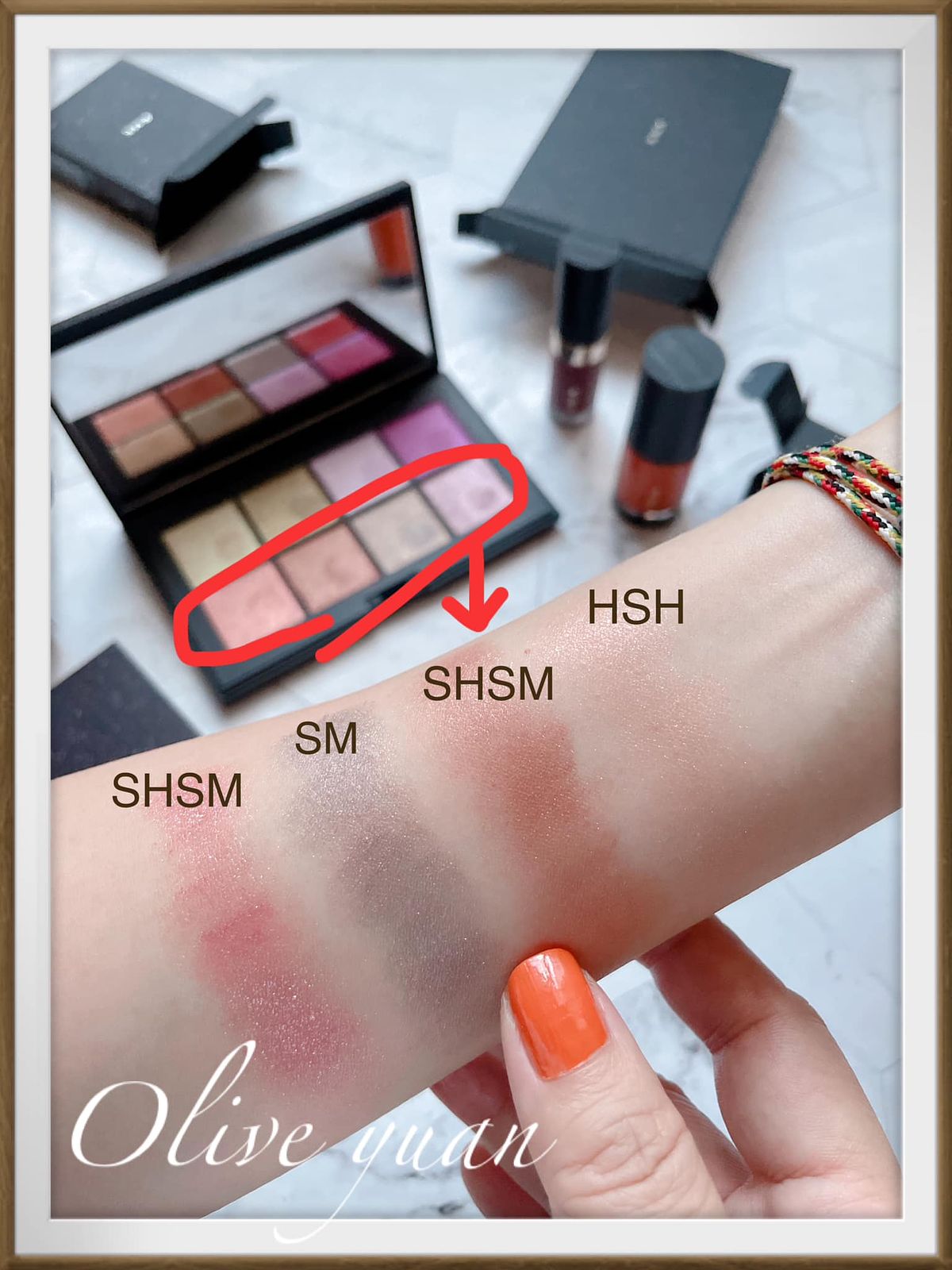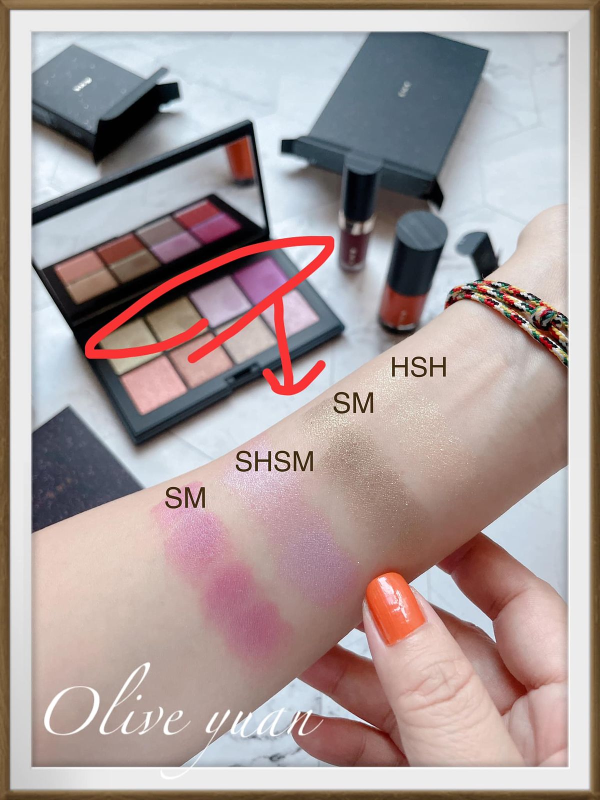 8色有3種質地,SM是亮澤爍光(3色),HSM為高亮燦(2色),SHSM是亮燦爍光(3色),我覺得最特別、具挑戰性的是右上角SM玫瑰色,整個就像這盤中的女王,除此之外的顏色都非常好上手,單擦疊擦~想怎麼用都行。
