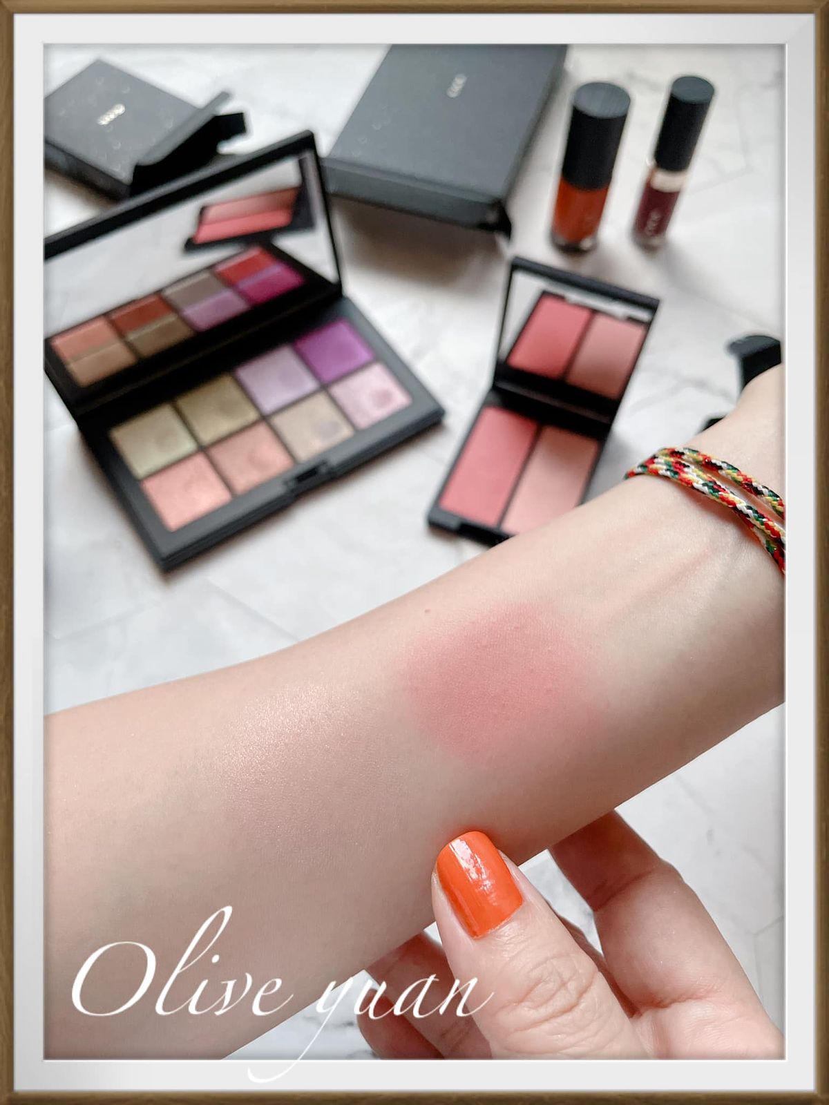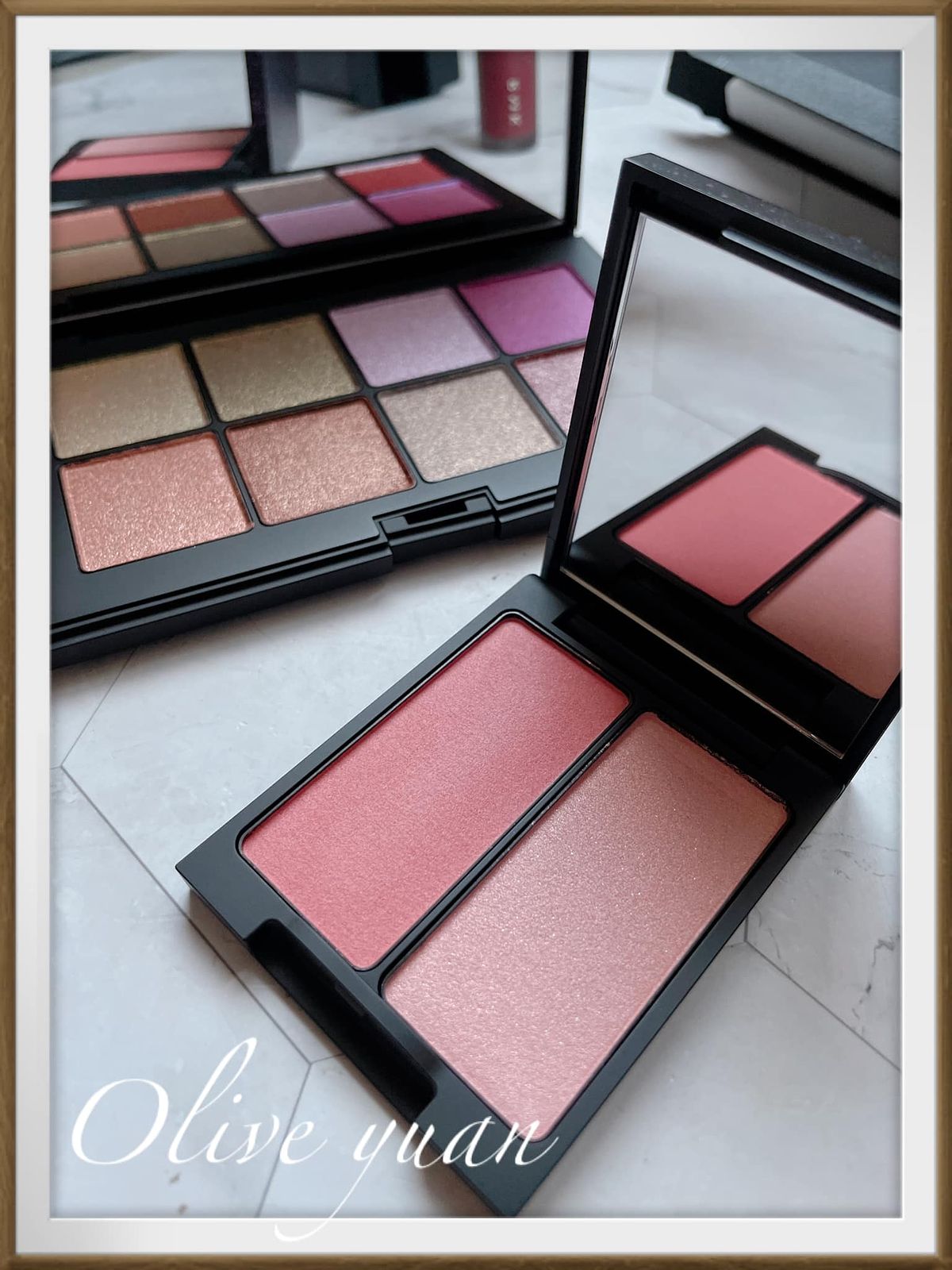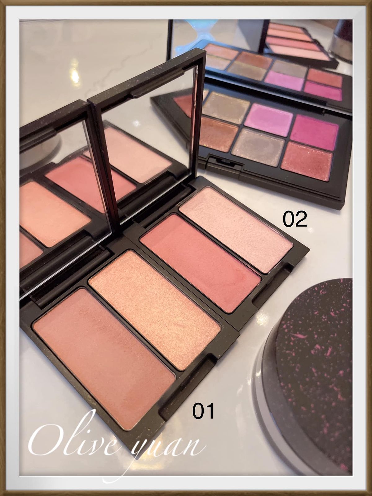 我入手的是02 Rose Parade,是非常柔和的玫瑰色,左邊是柔和發色但具透明度的顏色,右邊是帶有光感色澤的打亮色,不難上手,而且02比01更容易操作,因為02特別像肌膚原生血色,上再多層也很自然,這盤一樣單擦或疊擦都OK!