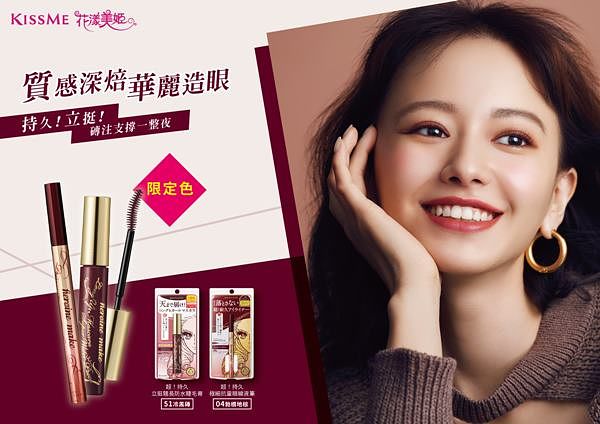 其中,KISSME花漾美姬主打經典不敗超!持久系列深焙的紅棕色:超!持久立挺翹長防水睫毛膏51冷黑磚,呈現高質感、低調華麗的捲翹纖長睫毛;優雅質感的超!持久極細抗暈眼線液筆 04勃根地棕,絕對是美拉德風格中最為亮眼點綴。將魅力藏在眉眼間,讓紅棕色層次堆疊出更為強烈的風格,更顯個人的獨特美學!冬季美拉格時尚持續延燒,KISSME花漾美姬各大通路同步限定上市。