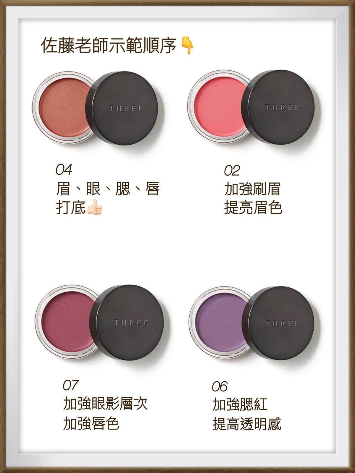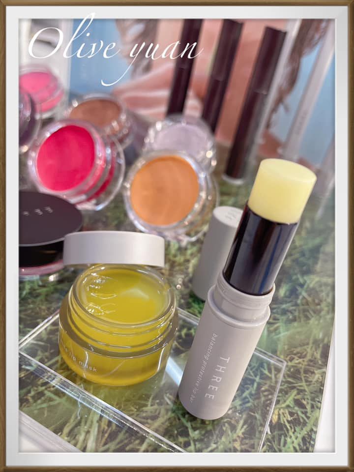 「平衡奢潤護唇膜(NT1,150)」除了THREE特有的精油成分,還添加了「銀耳多醣體、南非復活草、薑精油、寺藍藻多醣體、糖蜜、酒粕、溫州蜜柑果皮萃取精華」,所以具修護、保濕、循環等效果,佐藤老師除了用它幫模特兒做妝前唇部護理,也建議睡前當唇膜使用。