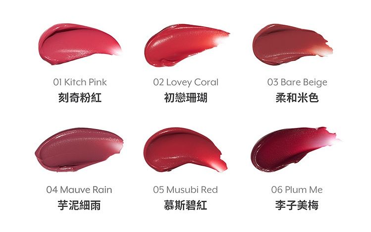 6款新色彩度都很接近,但還是有些微差別,01刻奇粉紅最裸,06李子美梅則最深,以此類推,如果想創造明顯漸層,就選深淺2色搭配使用,而唇緣不明顯的畫法也很簡單,只要由內往外塗抹至8分滿再抿唇即可。