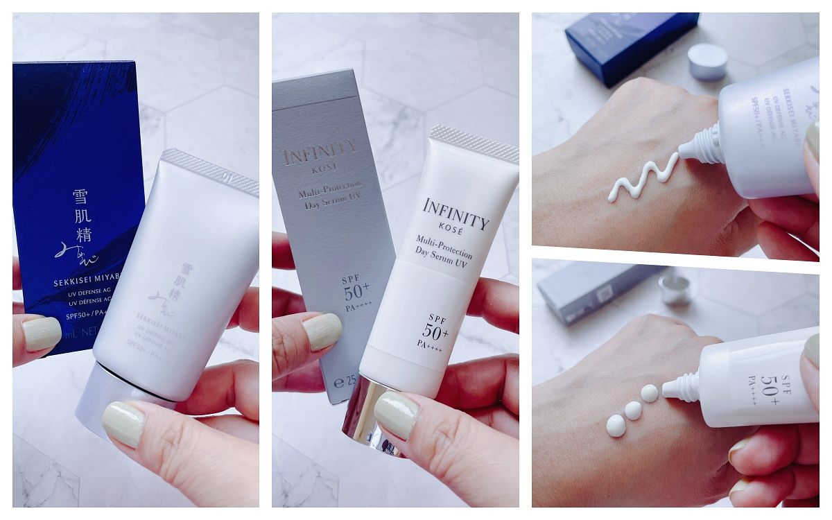 「雪肌精御雅」這款為強效型,除了高係數還添加「金雀花根淬取」、「米糠淬取」等抗氧、抗老成分。「INFINITY無限肌緻」則添加了「B3」及「美白成分」,還能隔離空氣中有害物質,例如空汙及花粉等等。
