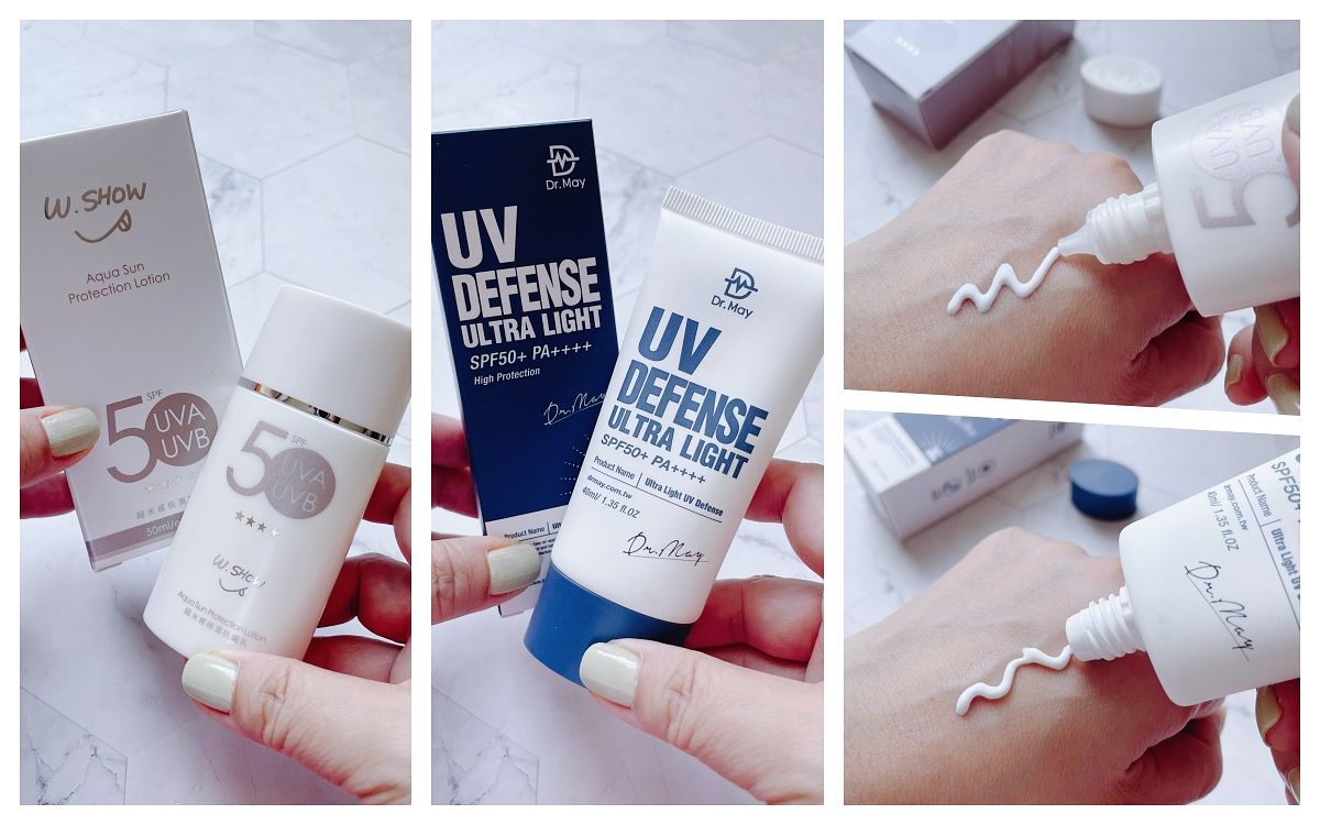 「W.SHOW」防曬除了高係數還能清涼如水乳,成分中添加的「蠶絲油」及「海藻醣」讓肌膚保濕潤澤,這款已經用到第3瓶。「Dr.May」防曬則添加獨家抗氧化成分「法莎酚」,清爽度也是今夏爆賣品!這2款都能防止紫外線的曬老曬乾。