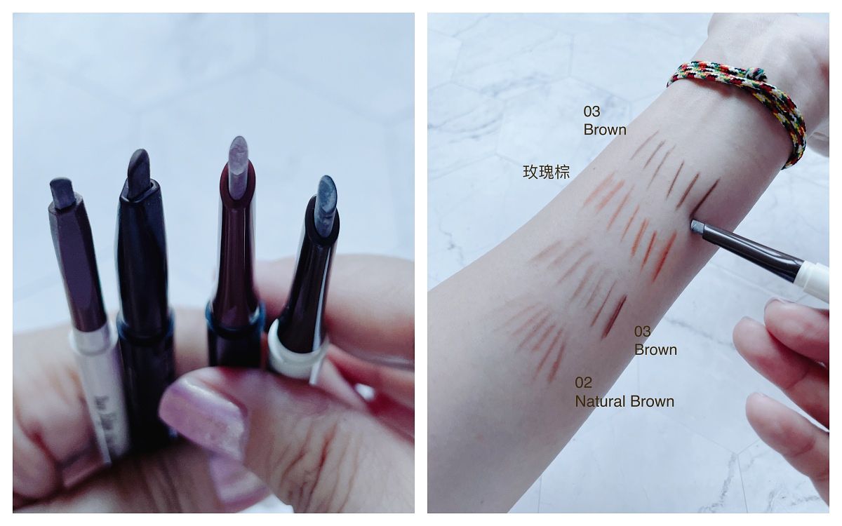 因為便宜、方便、筆芯細圓、還附眉刷,我從黑桿用到粉紅桿,油皮眉也很好畫,質地順滑不刮皮膚,持妝度也很不錯,不管是線條感或填補空隙都順手。