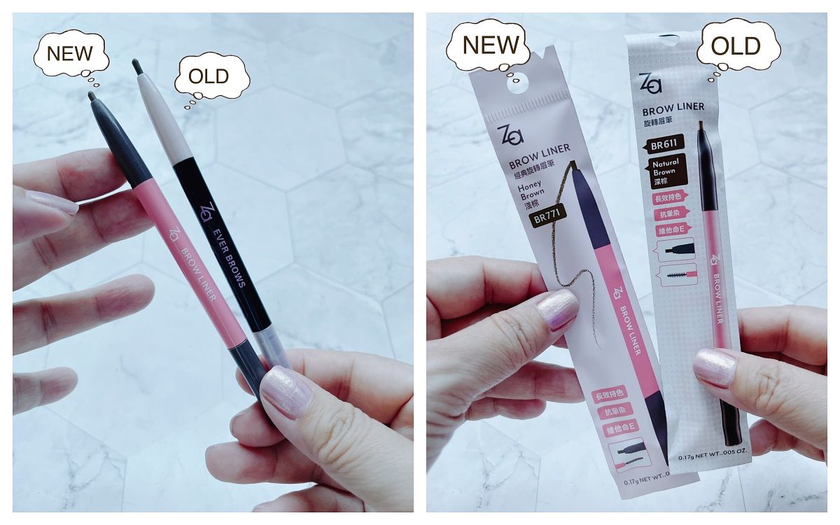 咖啡色筆桿為舊版,白色為新版,這支眉筆我一進入店裡就是“請給我3支”!它是橢圓形扁平筆芯,一樣轉換角度即可變換線條,而且筆芯非常滑、軟、好上色!也因此下手用力會太濃,只要控制好就非常順手。