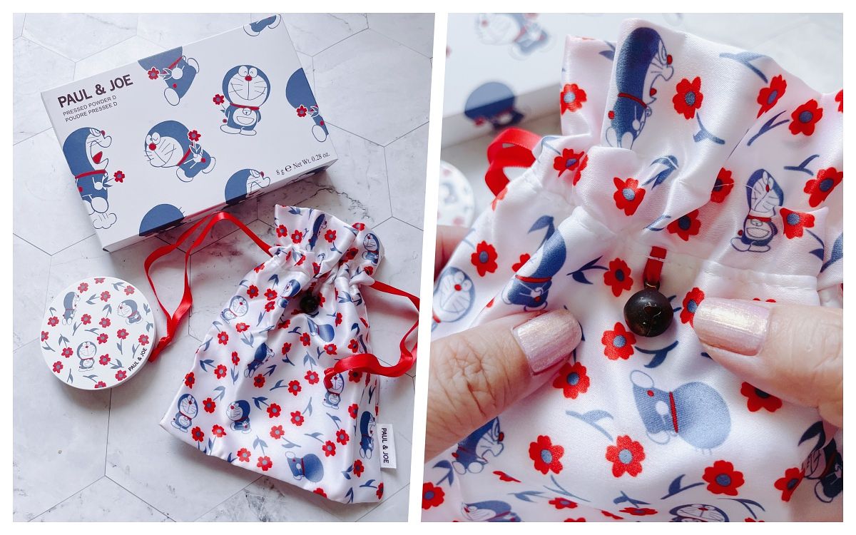 「哆啦A夢限量隔離蜜粉餅組」除了糖瓷隔離蜜粉餅,還有可愛收納袋,袋子上還縫了跟哆啦A夢一樣的鈴噹,只是太久都氧化了!紅花底紋也是這次系列的共通設計,重點是粉餅上的哆啦A夢壓紋,擺明了就是不給用呀!太可愛!