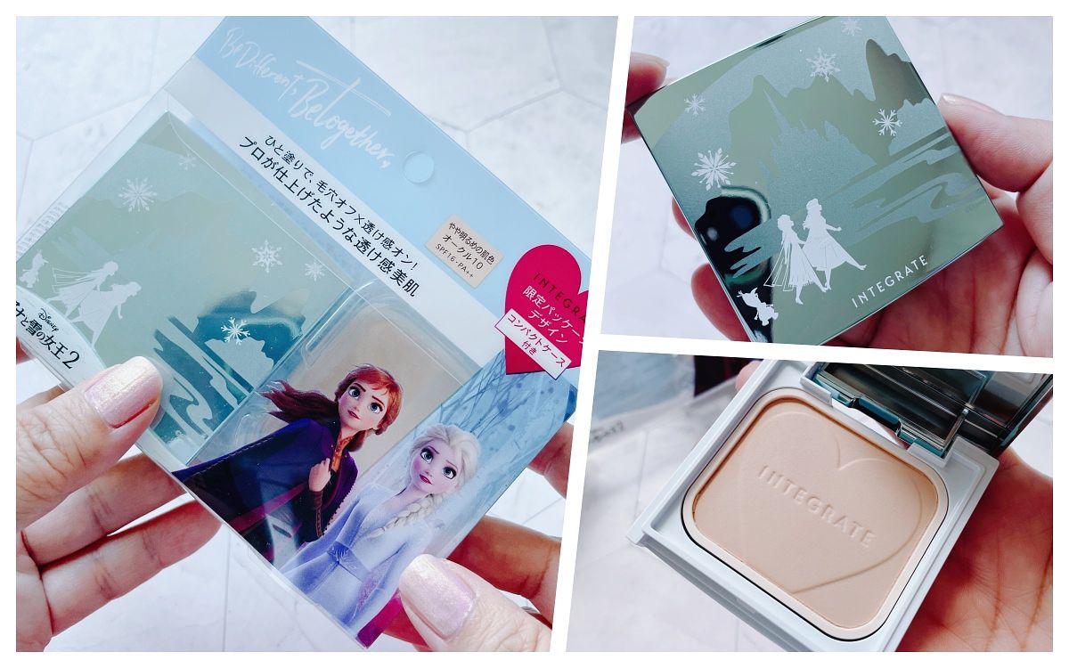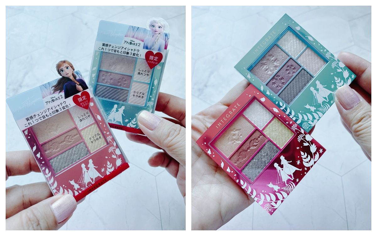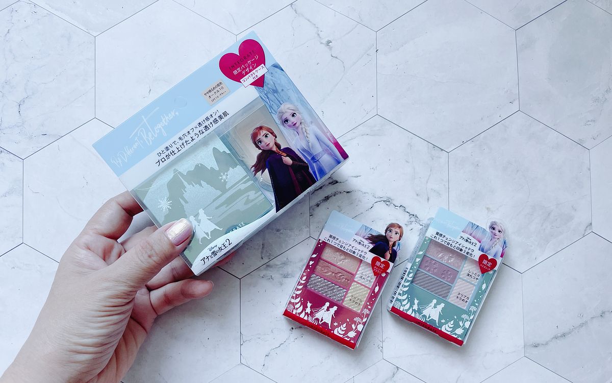 2019年12月到日本跨年時,在日本藥妝店看到的這組商品,已經被搶得剩陳列盒了,沒想到台灣於2020年1月也推出了!除了粉餅及眼影盤,還有眼線筆及香水,主要是以艾莎與安娜的形象來設計,還有小小的雪寶喔!