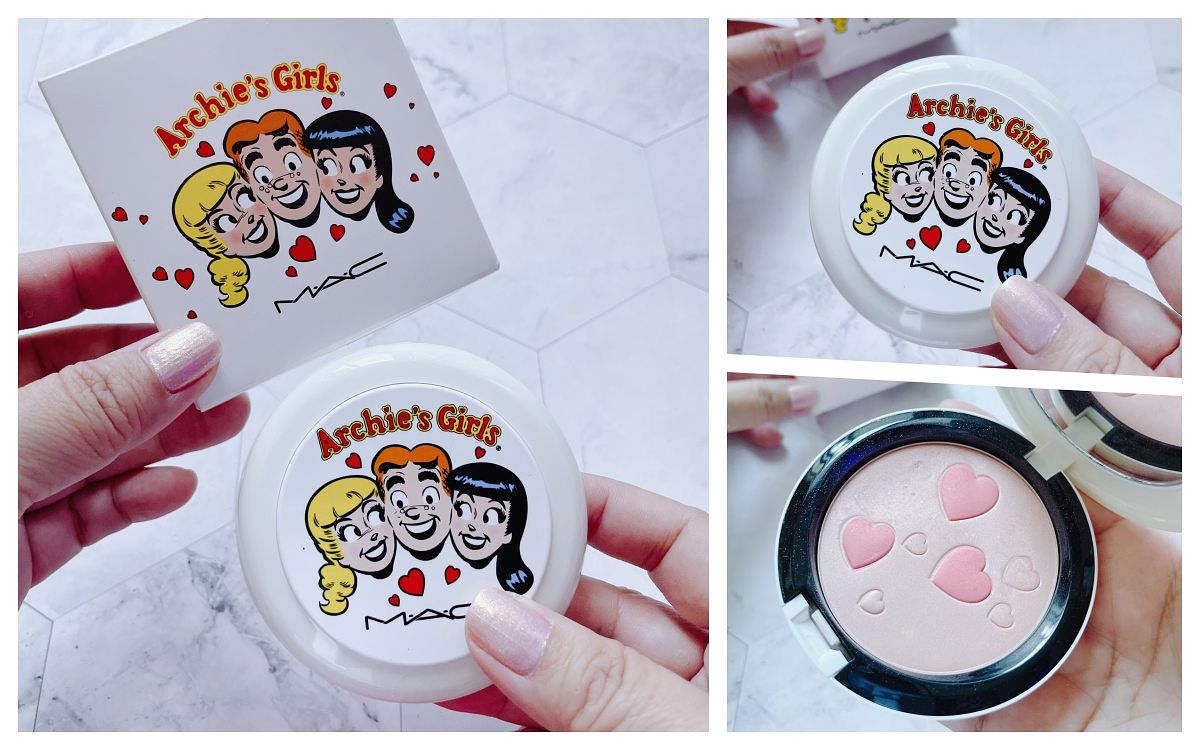 這系列好可愛,主題來自知名美國復古漫畫『Archie’s Girls』,主要是三角戀情的故事,M.A.C當時的訴求為~把妝化得美美的,就能獲得男主角的心喔!其中的腮紅打亮餅本來就是M.A.C明星商品,象徵愛情的小桃心位置我都避開捨不得刷!