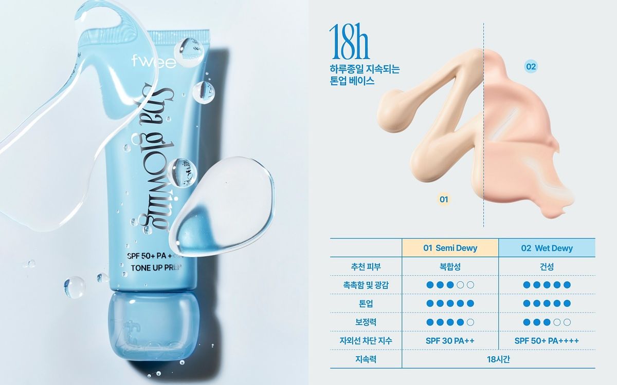 韓國官方全新推出的 Fwee Spa Glow Base 妝前乳預告,以「水光」與「內光」兩款質地滿足不同膚質需求。 01 號 Semi Dewy 內光款,適合混合肌與想要自然光澤的妝容,讓肌膚像天生好膚質; 02 號 Wet Dewy 水光款 則擁有更高保濕力與亮澤度,特別推薦給乾性肌與冬季使用。 質地細膩輕盈,一抹即可均勻提亮,打造出宛如做完 Spa 的柔潤光澤底妝~