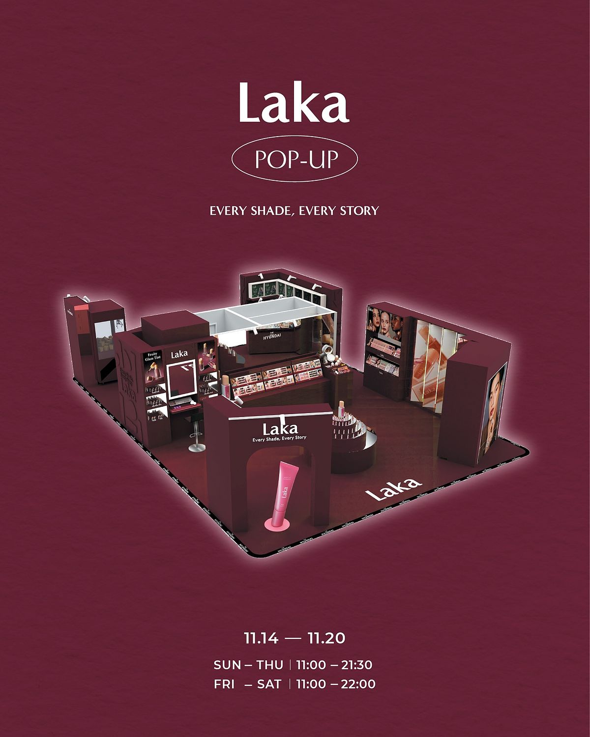 自創立以來,Laka 以「Love and Kind Artistry」精神,成為韓國第一個無性別彩妝品牌。品牌主張「美無界限」,不受性別、膚色與年齡的定義,鼓勵每個人以真實、自由、自信的方式詮釋自我。本次快閃店以「包容、自信、真實、簡約」四大價值為靈感,打造具藝術感的互動空間,邀請消費者親身體驗「Every Shade, Every Story」,用色彩說出屬於自己的故事。