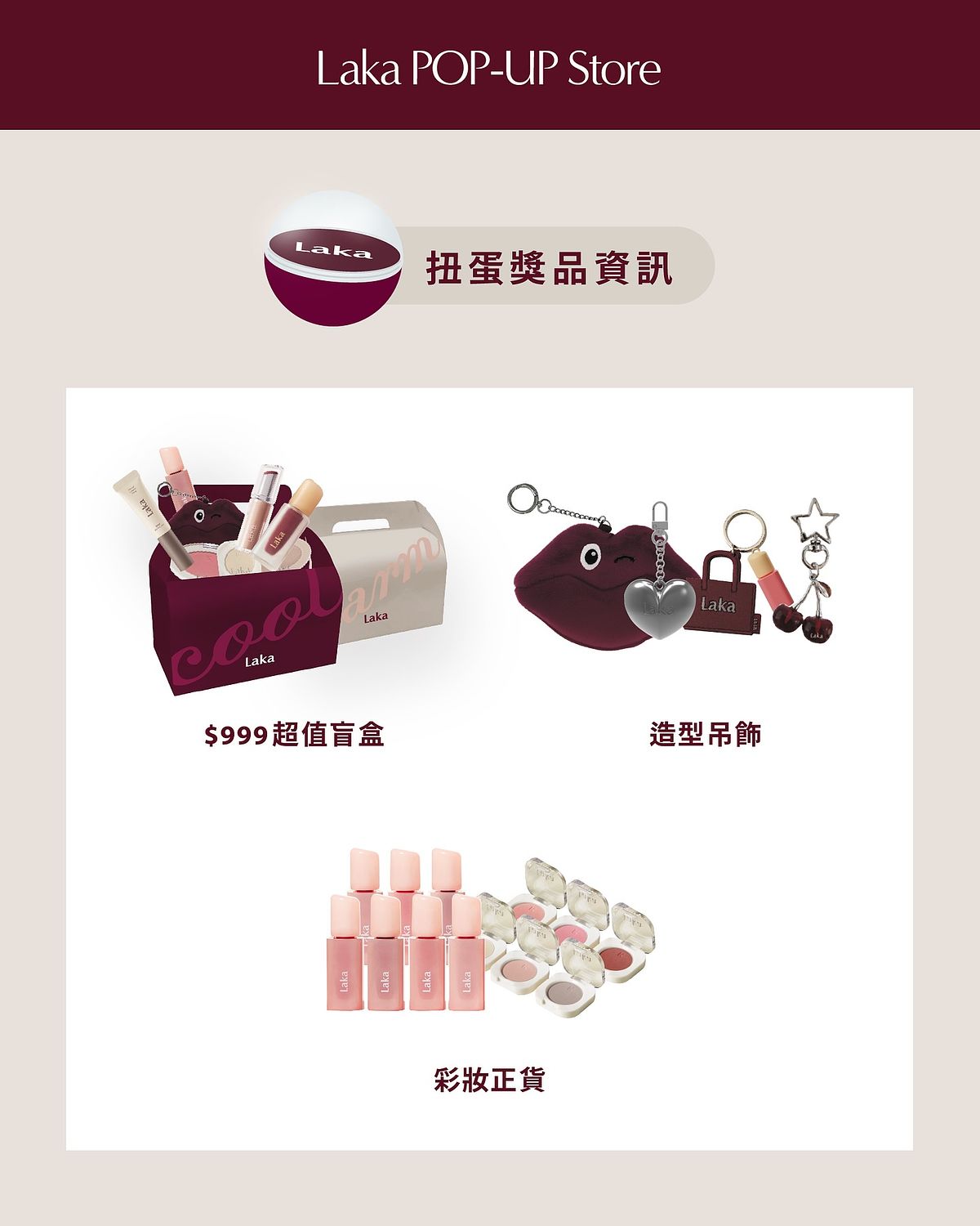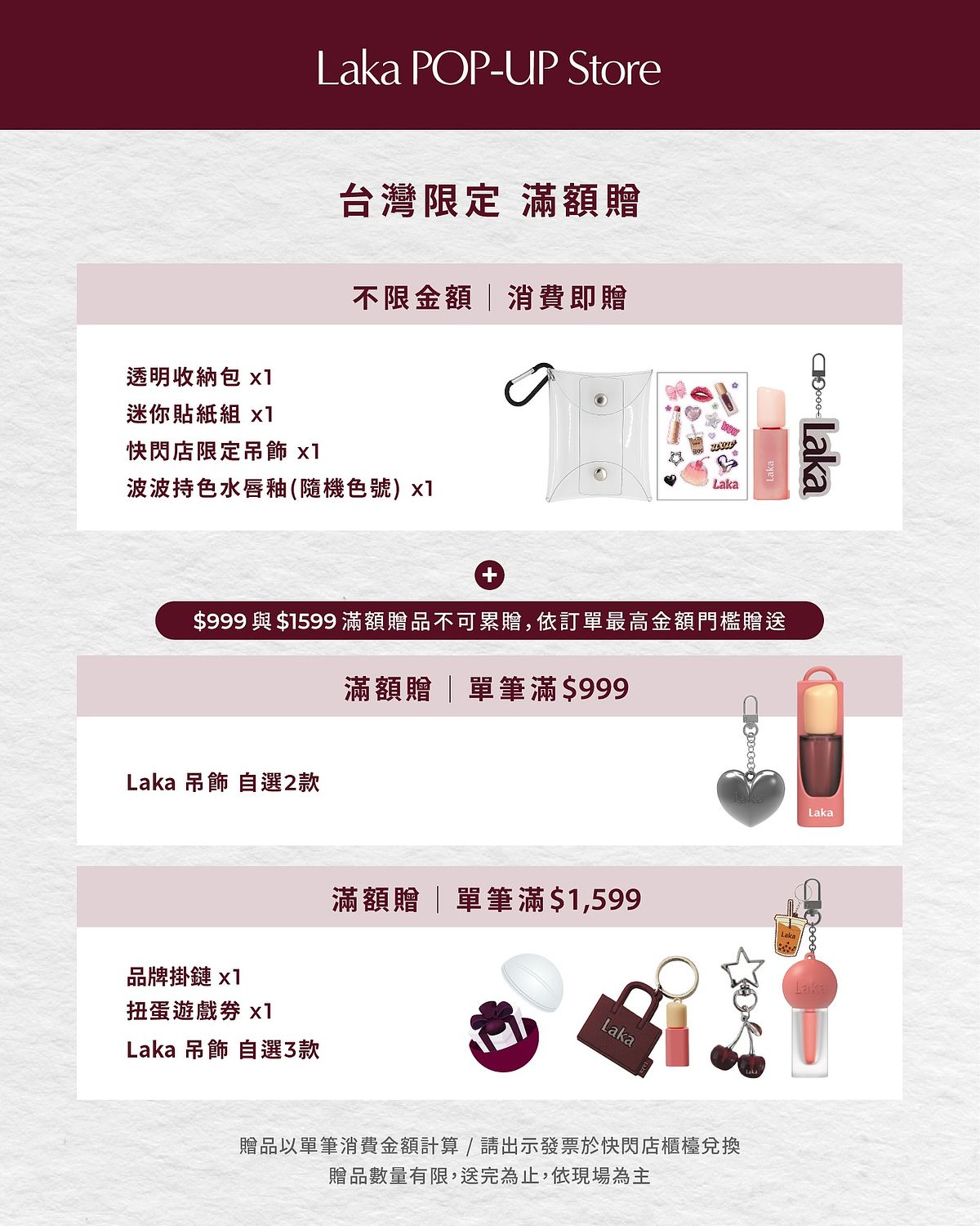 - 消費滿 NT$1,599:贈 Laka 吊飾任選 3 款 + 品牌掛鍊乙條 + 扭蛋遊戲券乙張