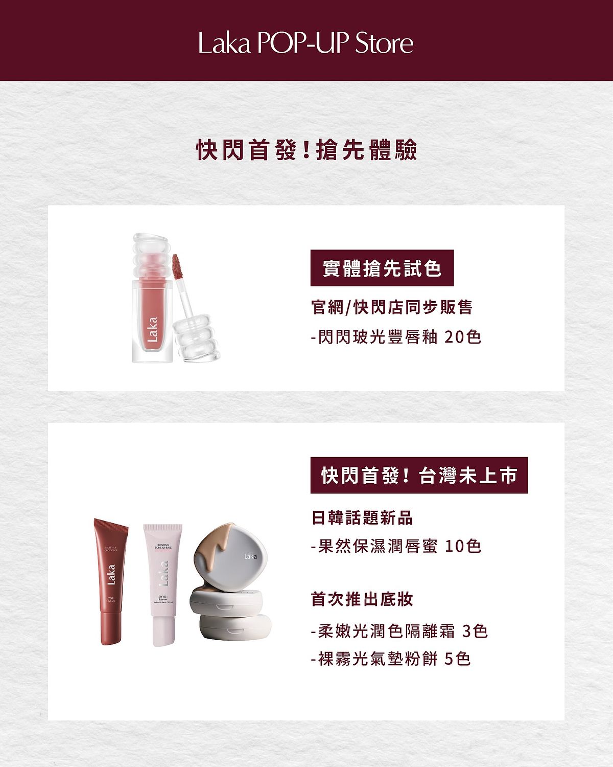 Laka 本次將於台灣首度亮相多款未上市新品,包含品牌首次亮色底妝產品:裸霧光氣墊粉餅,與品牌明星唇釉系列:Fruity Glam Tint 果然持久水光唇釉,以果汁般的水潤光澤與高達 50 色的飽滿色調打造自然又耀眼的雙唇,推出 台灣獨家新色:#131 Creamcha 微糖奶茶色、#136 Oolong 玫瑰烏龍色 ; Maxi Glayer Tint 閃閃玻光豐唇釉,輕盈的 Sheer Glow 質地與細緻亮澤感,完美展現從日常到派對的百變魅力 ; Fruity Lip Glotioner 果然保濕潤唇蜜(全色號登場),全新登場的潤唇蜜融合護唇與上妝功效,兼具水潤光澤與豐盈立體感,成為韓國話題新品 ; Laka Devil Lip 黑色唇膏,一抹瞬間上色、持久不掉色的全新「Devil Lip」系列強勢來襲!不黏膩、不厚重,卻能展現極致水潤與高飽和光澤感,詮釋性感又率性的無性別時尚態度。