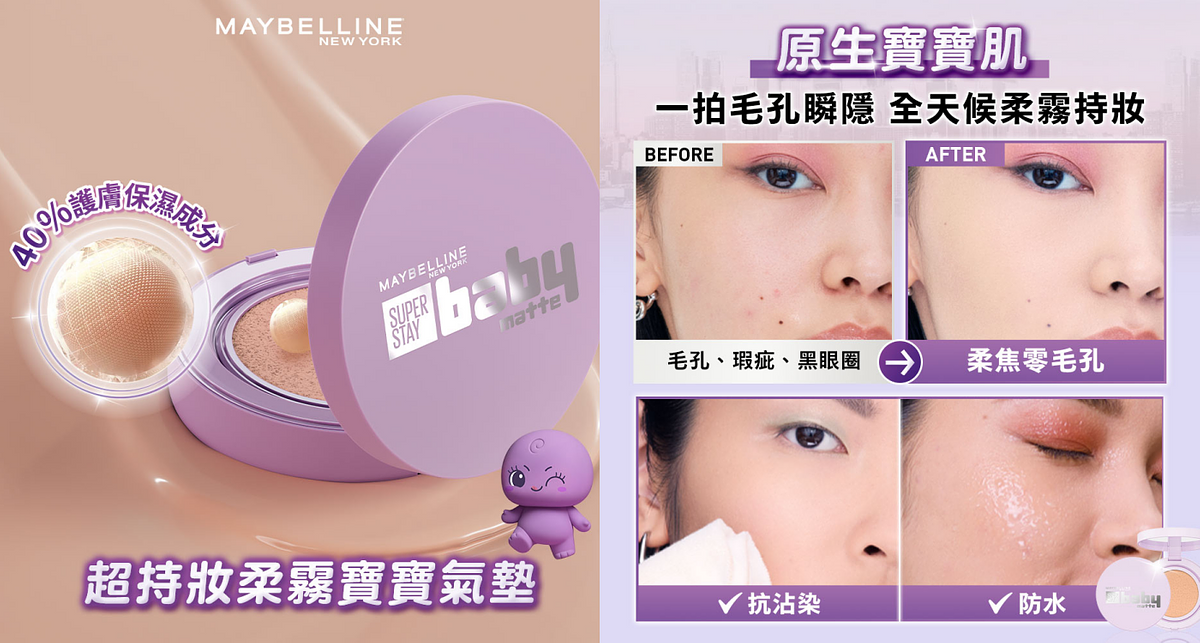 為了歡慶全新底妝上市,媚比琳於3月起推出全通路限時加碼活動,凡購買「超持妝柔霧寶寶氣墊」,就送質感實用兼具的「寶貝氣墊包」,延續寶寶氣墊的柔霧可愛風格設計,方便隨身攜帶補妝。贈品數量有限,送完為止。